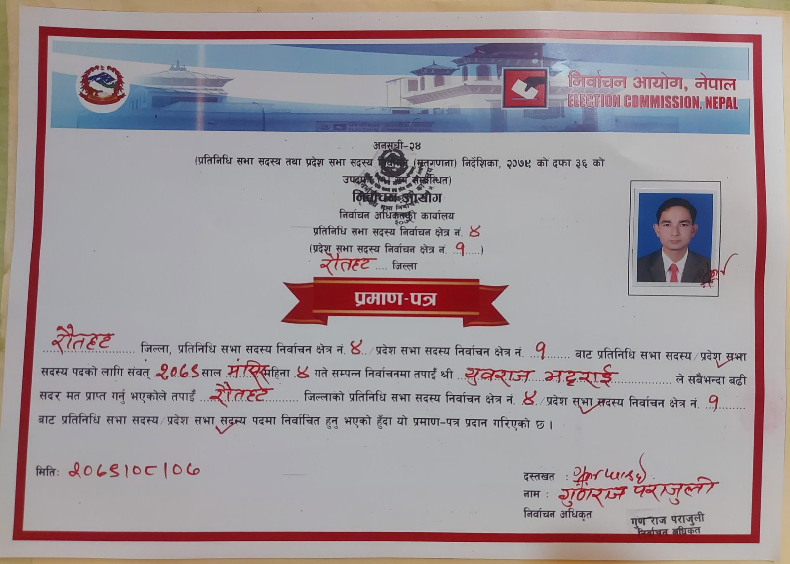 As candidate for the member of Province Assembly in Madhesh Pradesh, Bhattarai grabbed a landslide victory with a total of 15,368 votes.